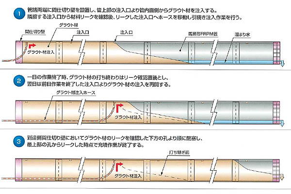 ❶管路両端に間仕切り壁を設置し、管上部の注入口より管内面側からグラウト材を注入する。 隣接する注入口から材料リークを確認後、リークした注入口へホースを移動し引続き注入作業を行う。